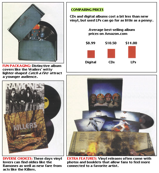Like the comeback of Puma sneakers or vintage T-shirts, vinyl's resurgence has benefited rom its retro-rock aura. Many young listeners discovered LP's after they rifled through their parents' collections looking for oldies and found that they liked the warmer sound quality of records, the more elaborate album covers and liner notes that come with them, and the experience of putting one on and sharing it with friends, as opposed to plugging in some earbuds and listening alone. "Bad sound on an iPod has had an impact on a lot of people going back to vinyl," says David MacRunnel, a 15-year-old high school sophomore from Creve Coeur, Mo., who owns more than 1,000 records. The music industry, hoping to find another revenue source that doesn't easily lend itself to illegal downloads, has happily jumped on the bandwagon. Contemporary artists like the Killers and Ryan Adams have begun issuing their new releases on vinyl in addition to the CD and MP3 formats. As an extra lure, many labels are including coupons for free audio downloads, with their vinyl albums so that Generation Y music fans can get the best of both worlds: high-quality sound at home and iPod portability for the road. Also, vinyl's different shapes (hearts, triangles) and eye-catching designs (bright colors, sparkles) are created to appeal to a younger audience. While new records sell for about $14, used LPs go for as little as a penny -- perfect for a teenager's budget -- or as much as $2,400 for a collectible, autographed copy of Beck's Steve Threw Up. Vinyl records are just a small scratch on the surface when it comes to total album sales -- only about 0.2%, compared to 10% for digital downloads and 89.7% or CDs, according to Nielsen SoundScan -- but these numbers may underrepresent the vinyl trend since they don't always include sales at smaller indie shops where vinyl does best. Still, 990,000 vinyl albums were sold in 2007, up 15.4% from the 858,000 units bought in 2006. Mike Dreese, CEO of Newbury Comics, a New England chain of independent music retailers that sells LPs and CDs, says his vinyl sales were up 37% last year, and Patrick Amory, general manager of indie label Matador Records, whose artists include Cat Power and the New Pornographers, claims, "We can't keep up with the demand."